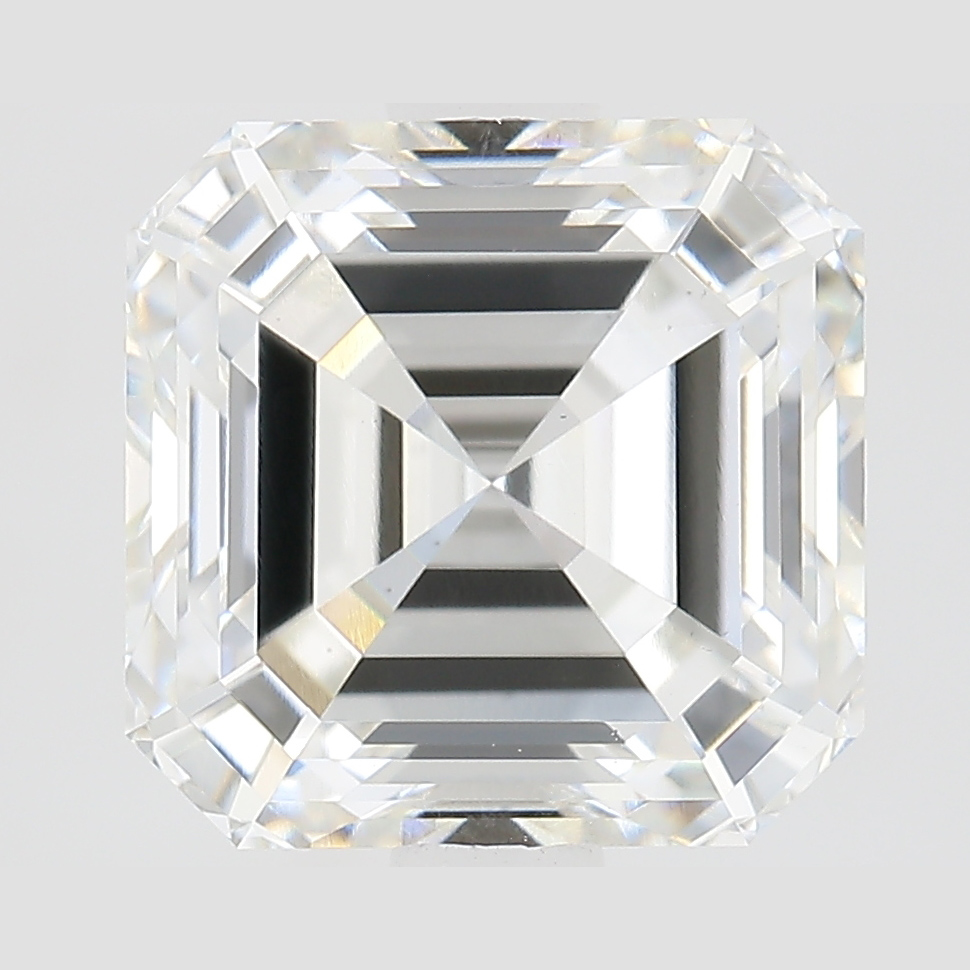 A labexcellentcreated 2.78 carat, asscher cut diamond, color grade F (colorless), clarity grade VS1 (very slightly included).A type IIa diamond certified by the International Gemological Institute (IGI).