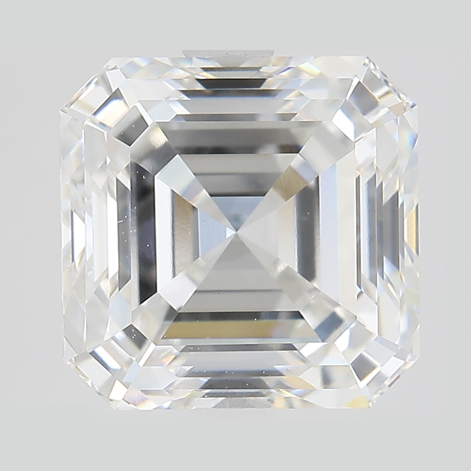 A labexcellentcreated 3.1 carat, asscher cut diamond, color grade F (colorless), clarity grade VVS2 (very very slightly included).A type IIa diamond certified by the International Gemological Institute (IGI).