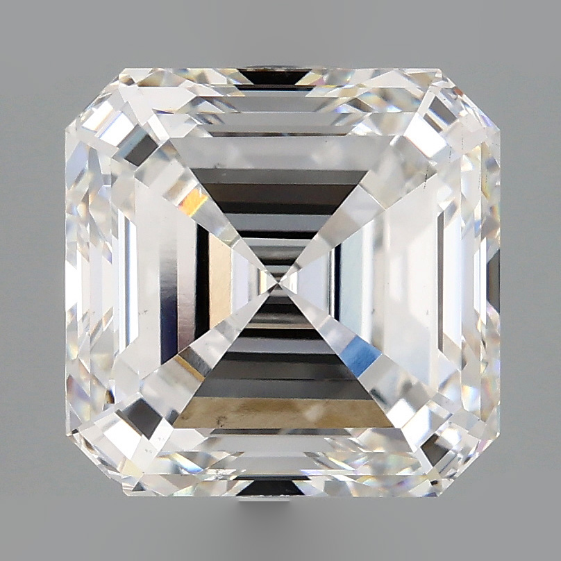 A lab-created 4.42 carat, asscher cut diamond, color grade E (colorless), clarity grade VS2 (very slightly included).A type IIa diamond certified by the International Gemological Institute (IGI).