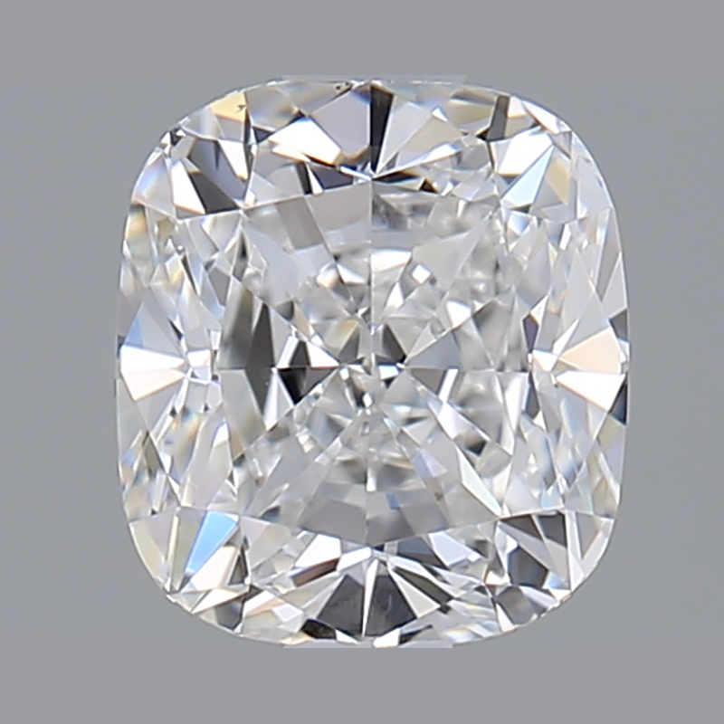 A lab-created 1 carat, cushion brilliant cut diamond, color grade E (colorless), clarity grade VVS2 (very very slightly included).A type IIa diamond certified by the International Gemological Institute (IGI).