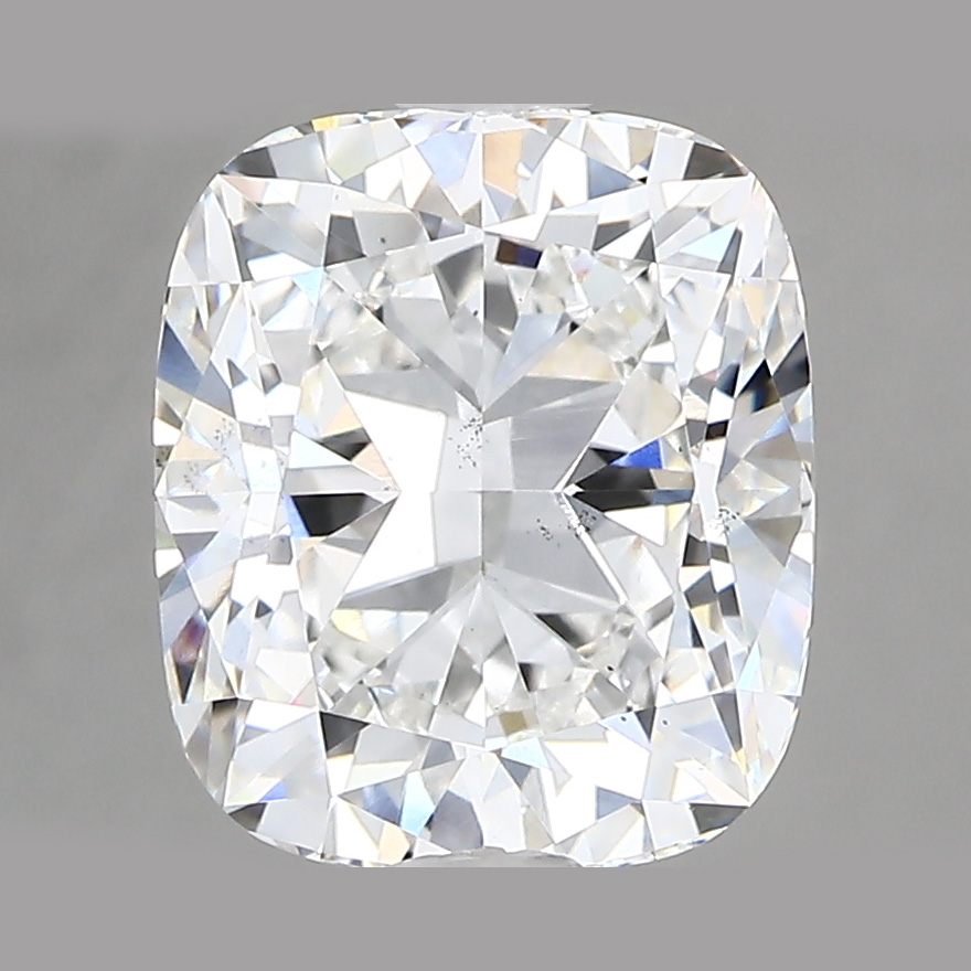 A lab-created 3.01 carat, cushion brilliant cut diamond, color grade G (near colorless), clarity grade VS1 (very slightly included).A type IIa diamond certified by the International Gemological Institute (IGI).