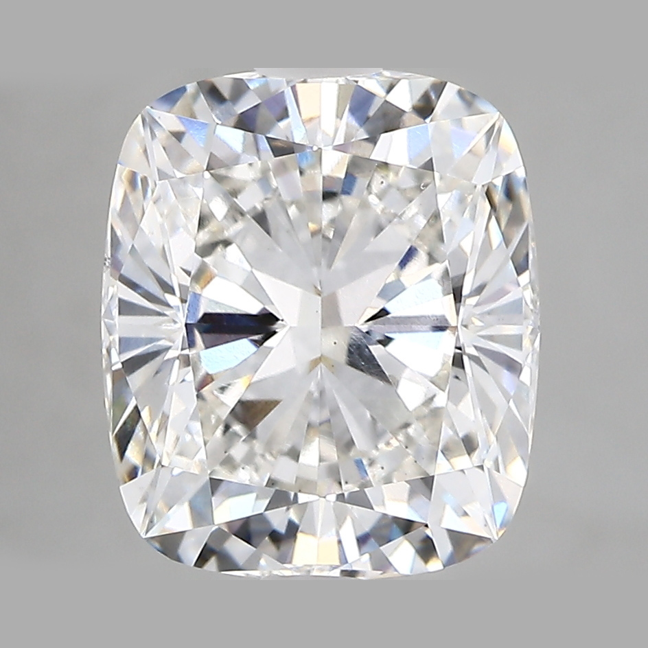 A lab-created 4.45 carat, cushion brilliant cut diamond, color grade G (near colorless), clarity grade VS1 (very slightly included).A type IIa diamond certified by the International Gemological Institute (IGI).