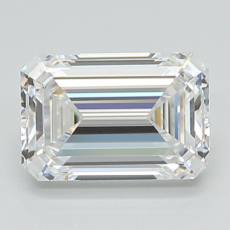 A lab-created 1.84 carat, emerald cut diamond, color grade E (colorless), clarity grade VS1 (very slightly included).A type IIa diamond certified by the Gemological Institute of America (GIA).