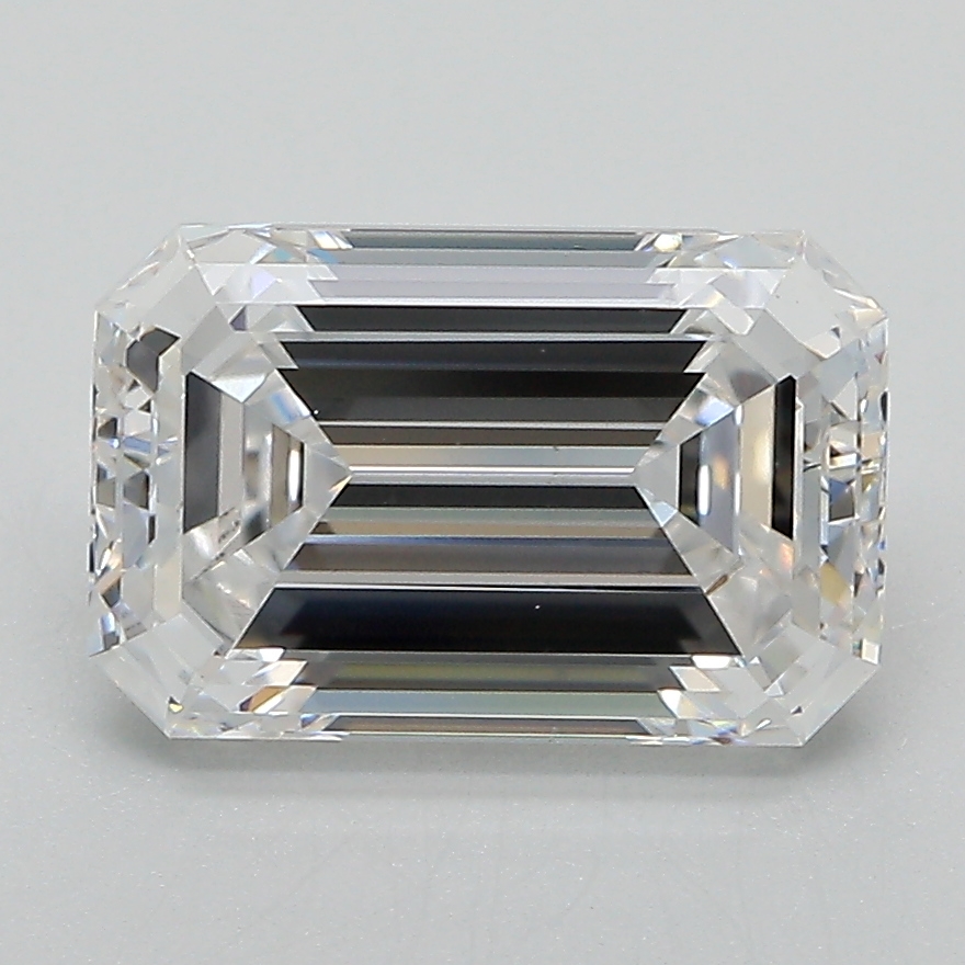 A labexcellentcreated 3.07 carat, emerald cut diamond, color grade G (near colorless), clarity grade VS1 (very slightly included).A type IIa diamond certified by the International Gemological Institute (IGI).