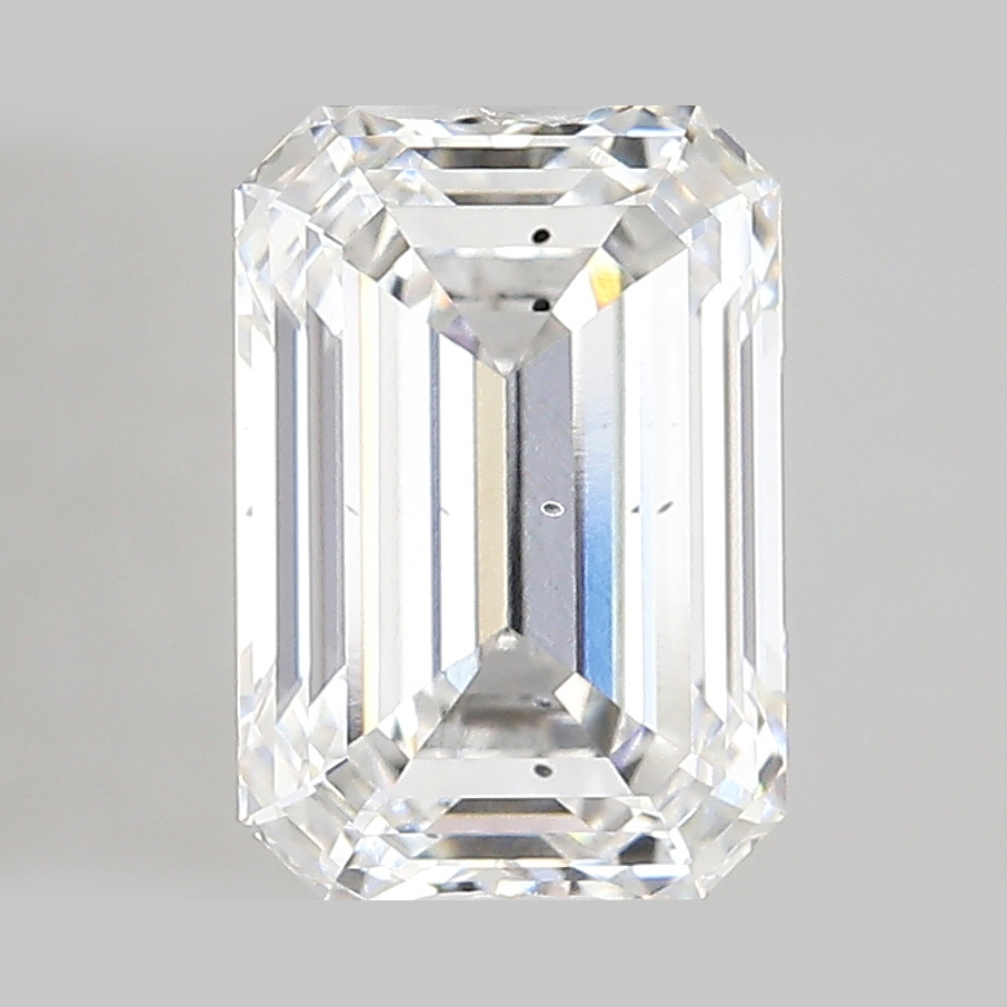 A labexcellentcreated 3.44 carat, emerald cut diamond, color grade E (colorless), clarity grade SI1 (slightly included).A type IIa diamond certified by the International Gemological Institute (IGI).