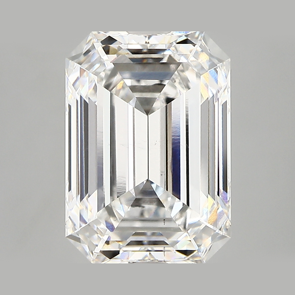 A lab-created 4.6 carat, emerald cut diamond, color grade F (colorless), clarity grade VS2 (very slightly included).A type IIa diamond certified by the International Gemological Institute (IGI).