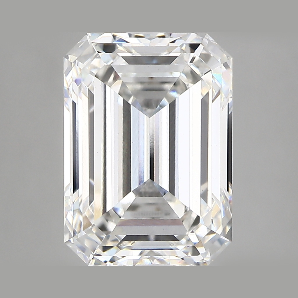 A lab-created 4.77 carat, emerald cut diamond, color grade G (near colorless), clarity grade VS1 (very slightly included).A type IIa diamond certified by the International Gemological Institute (IGI).