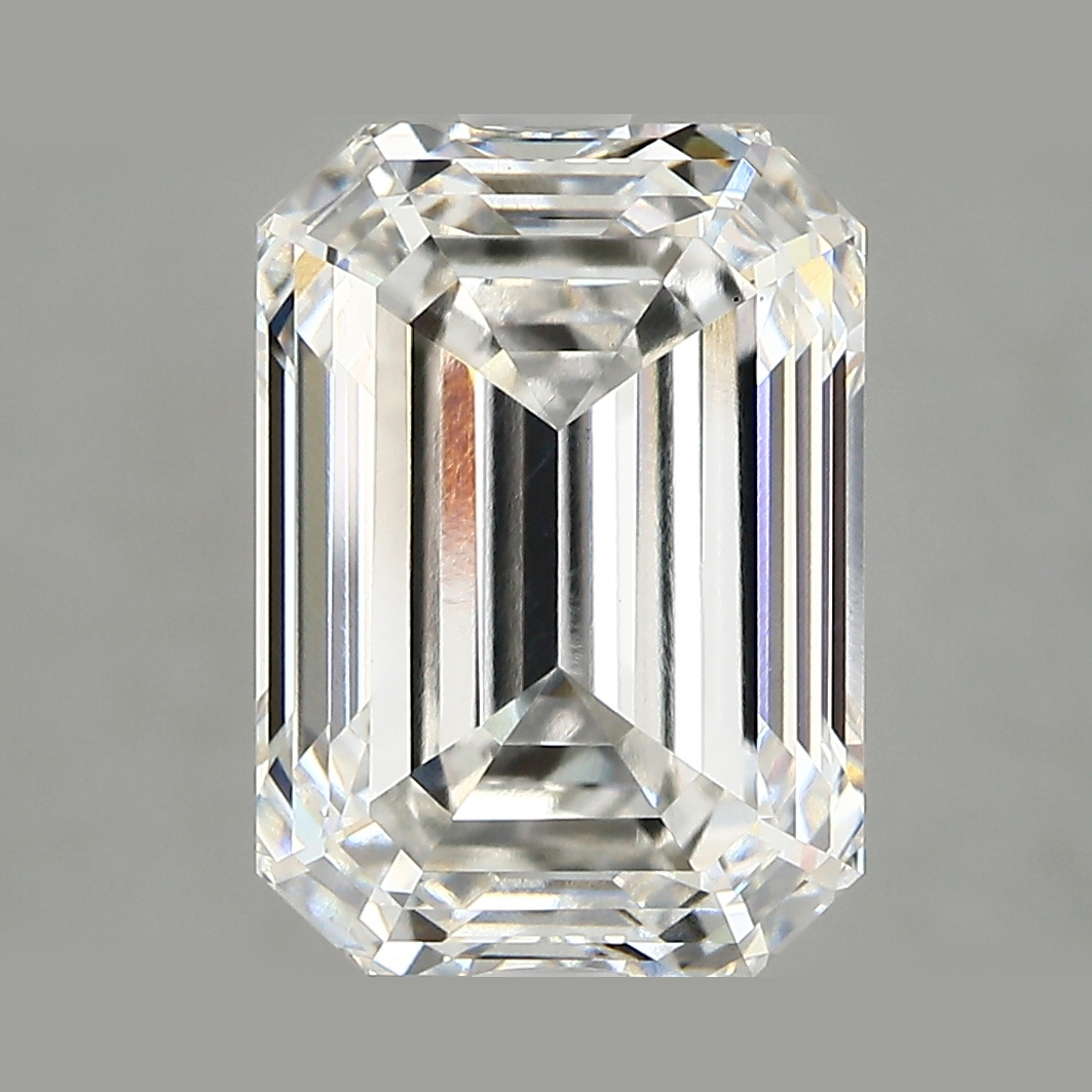 A lab-created 4.8 carat, emerald cut diamond, color grade G (near colorless), clarity grade VS1 (very slightly included).A type IIa diamond certified by the International Gemological Institute (IGI).