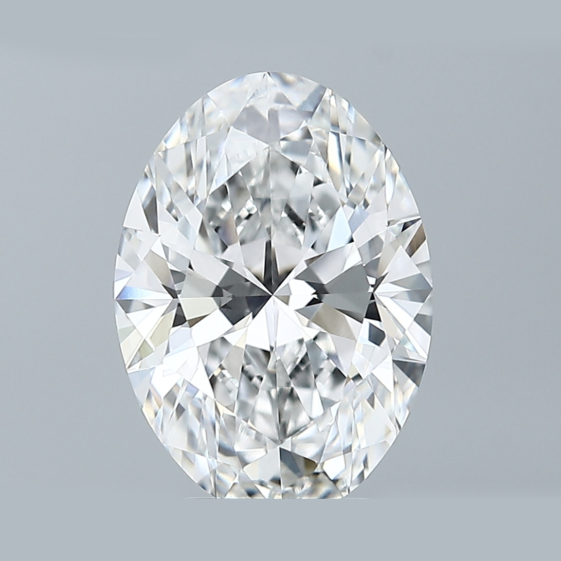 A lab-created 3.8 carat, oval brilliant cut diamond, color grade E (colorless), clarity grade VVS2 (very very slightly included).A type IIa diamond certified by the The Gemological Institute of America (GIA).