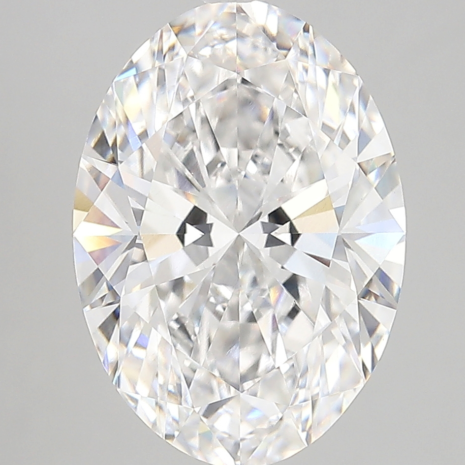 A lab-created 5.02 carat, oval brilliant cut diamond, color grade E (colorless), clarity grade VVS2 (very very slightly included).A type IIa diamond certified by the Gemological Institute of America (GIA).