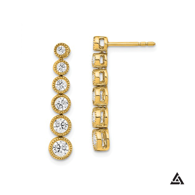 Six stunning bezel-set diamonds dangle down 1.5 inches from the post of each piece in this earring design. The total carat weight of the lab-created round brilliant diamonds is 0.99. The color and clarity grade is D-F/ VS-SI. Fashioned in 14k Yellow Gold and secures with push backs.