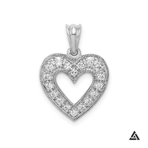 A classic open heart pendant embellished with lab-grown diamonds and milgrain edges in 14k White Gold. The total diamond weight of the diamonds is 0.24 carats. The average color and clarity grade is G-H/SI. An 18-inch 14k White Gold cable chain with spring-ring clasp is included. A perfect valentine gift for your special someone.