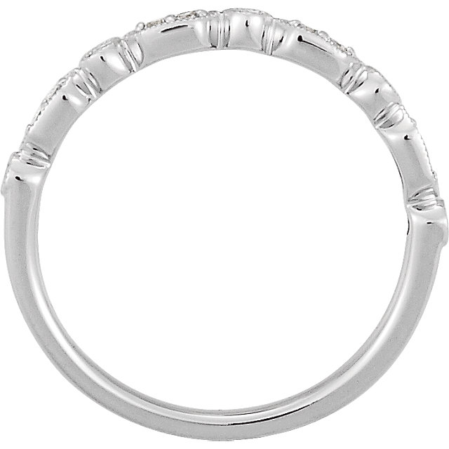 Stackable wedding band accented with 13 round diamonds of 0.12 total carat weight.